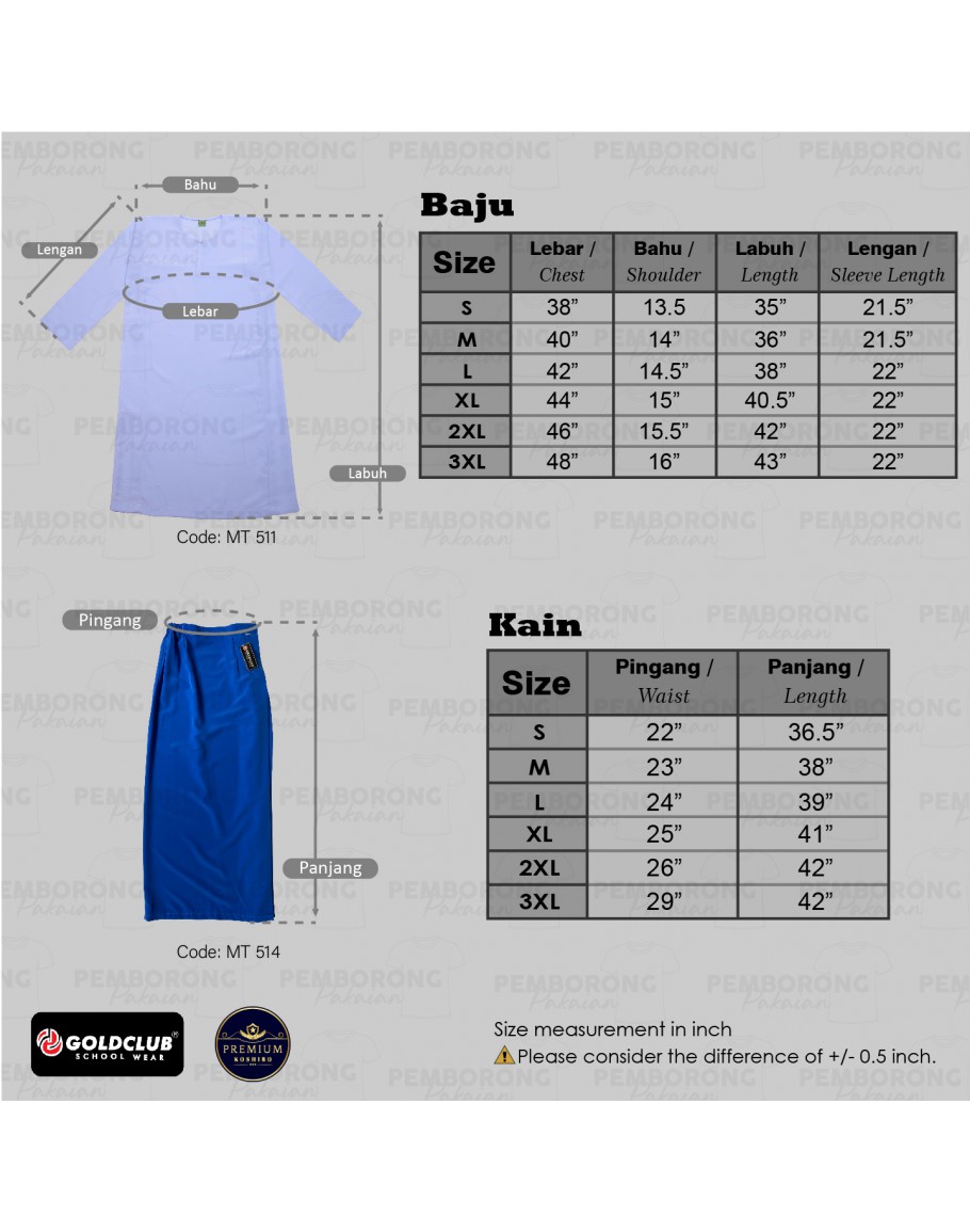 GOLD CLUB Baju Kurung Putih Sekolah Menengah/ Biru Kain Sarung/ Kain Koshibo #MT511 #MT514